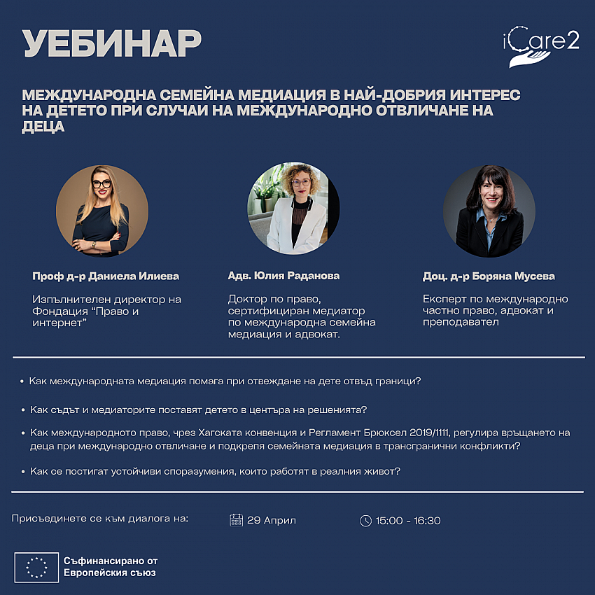 Този уебинар е ценен както за юристи и медиатори, така и за всички, които се интересуват от правата на детето, семейното право и алтернативните методи за разрешаване на спорове. Ще получите:
